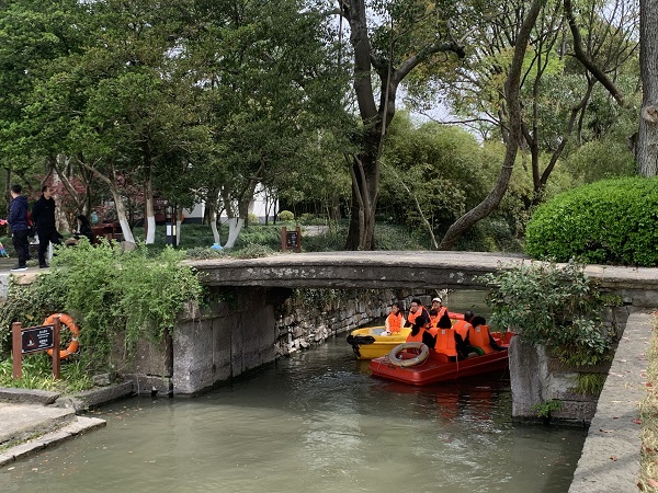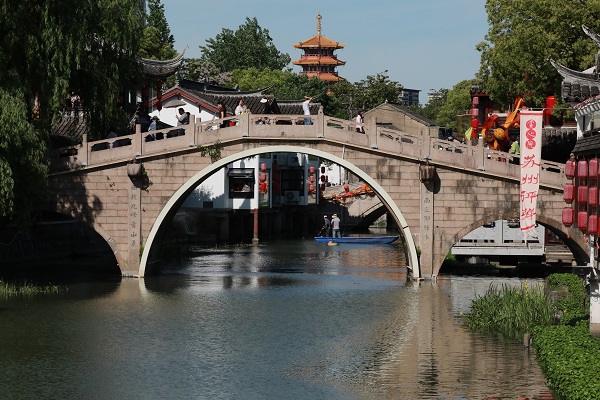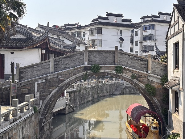 更妙的是古桥与周边环境的交融:桥上可见商铺民居鳞次栉比,桥头亭廊映绿树,居民闲坐闲谈;沿河茶馆里,茶客凭窗望桥,恰如卞之琳《断章》所写,尽显沪派江南的烟火与雅致。